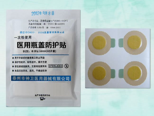 醫(yī)用瓶蓋防護貼(商品名:醫(yī)用瓶蓋貼)由醫(yī)用膠帶、涂壓敏膠的PVC膜或PE膜,吸水墊和硅油紙組成。本品為無菌產(chǎn)品。